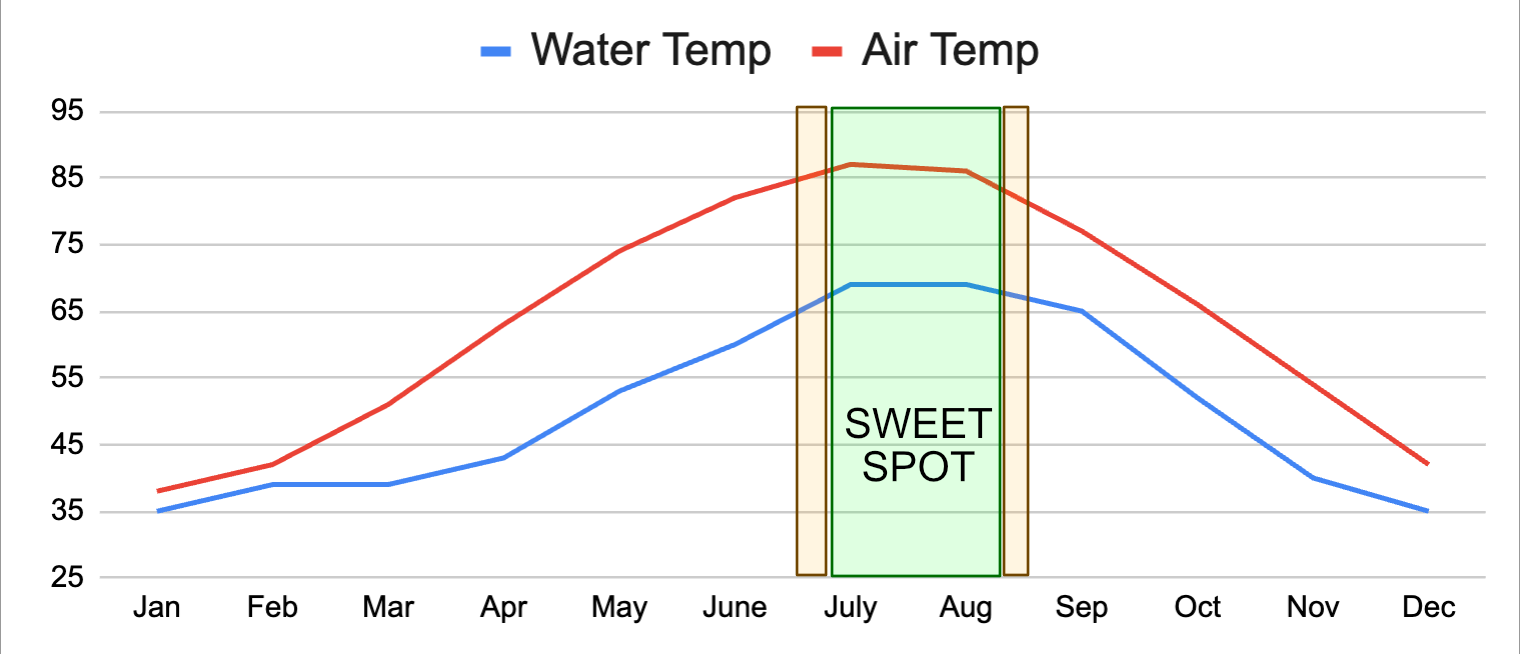 Being in the water for hours makes a big difference so it really is ideal go in July or August when water temp is 69 degrees on average. The number 1 fun killer is getting cold and having no way to get warm.