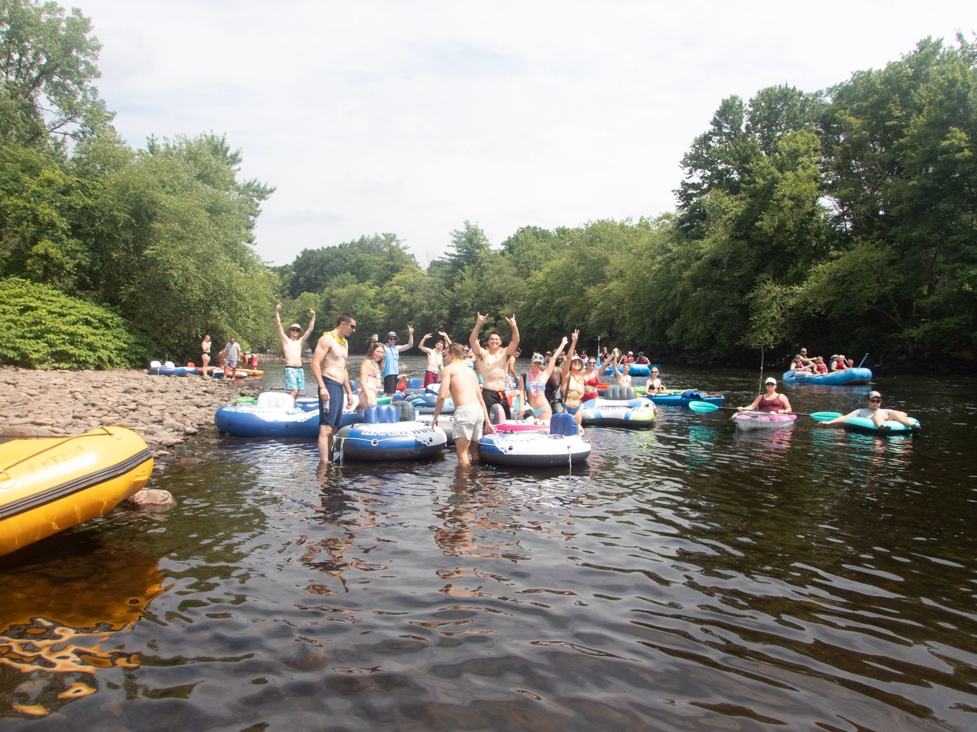 Meet everyone at either the take out, then load as many people as possible into cars going to the put-in. Remember to tube down with your keys! When everyone gets to the takeout there are two teams. Team A fits as many people as they can to take people back to their car at the put in. Team B deflates and packs the tubes. Once team A all come back everything will be packed and ready to go home.